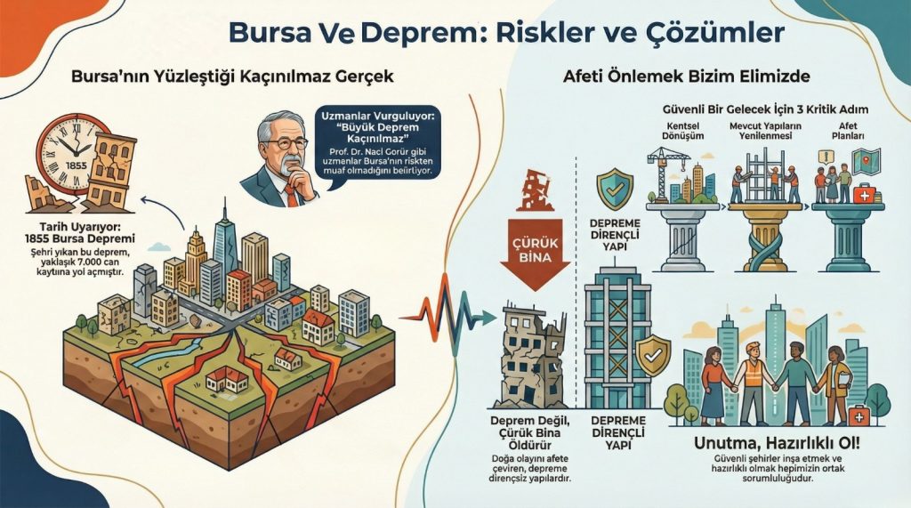 Deprem uzmanları uzun yıllardır Bursa’yı uyarıyor. Prof. Dr. Naci Görür, Marmara Bölgesi’nde büyük bir depremin kaçınılmaz olduğunu ve Bursa’nın bu riskten muaf olmadığını sık sık vurguluyor. Uzmanlara göre Bursa’da olası bir büyük deprem için yapılması gereken en önemli adımlar; kentsel dönüşümün hızlandırılması, mevcut yapı stokunun yenilenmesi ve afet planlarının uygulamaya geçirilmesidir.